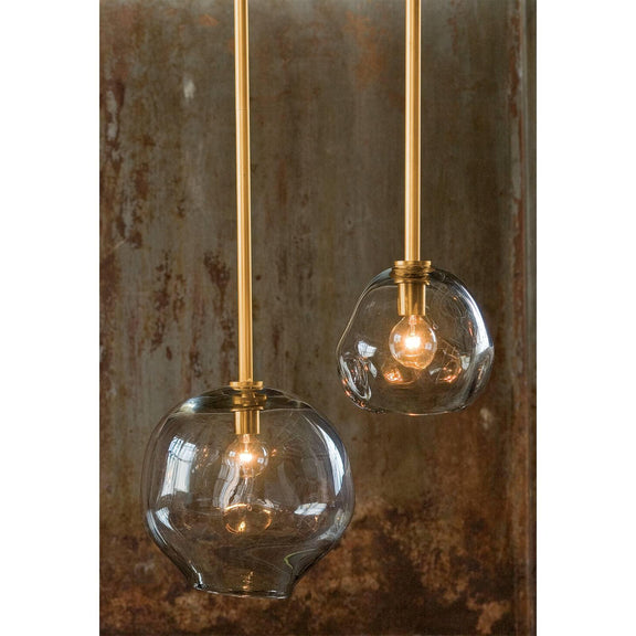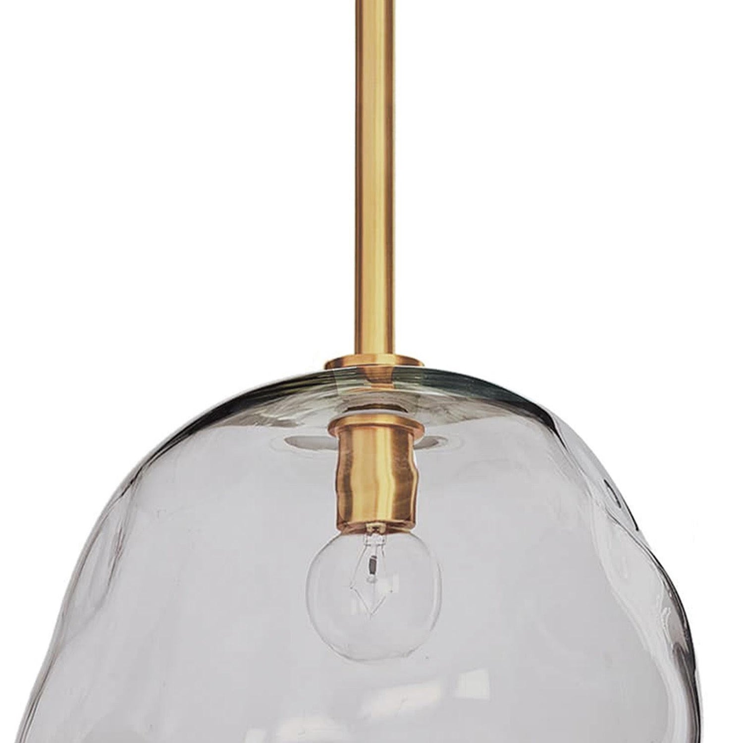 Molten glass has an inherent beauty because of its artisan-crafted, organic form. The natural, smoked glass shade variation creates dramatic light play and contrast, especially when combined with the modern appeal of its natural brass pipe, canopy, and components. Use as one pendant above a kitchen or powder room sink, or in multiples above a dining room table, kitchen island, or bedside lighting. This simple, sculptural lighting fixture is sure to add style and drama to your space.
