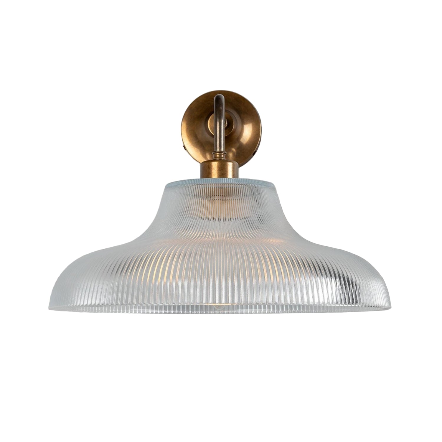 The ribbed texture of the shade enhances its ability to disperse light, creating a warm and inviting glow. Inspired by the practical lighting found in train stations, its timeless design is accentuated by a sleek brass arm that gracefully curves from the wall plate, forming an elegant shape. The durable materials and vintage-inspired details make it a standout piece for any room.