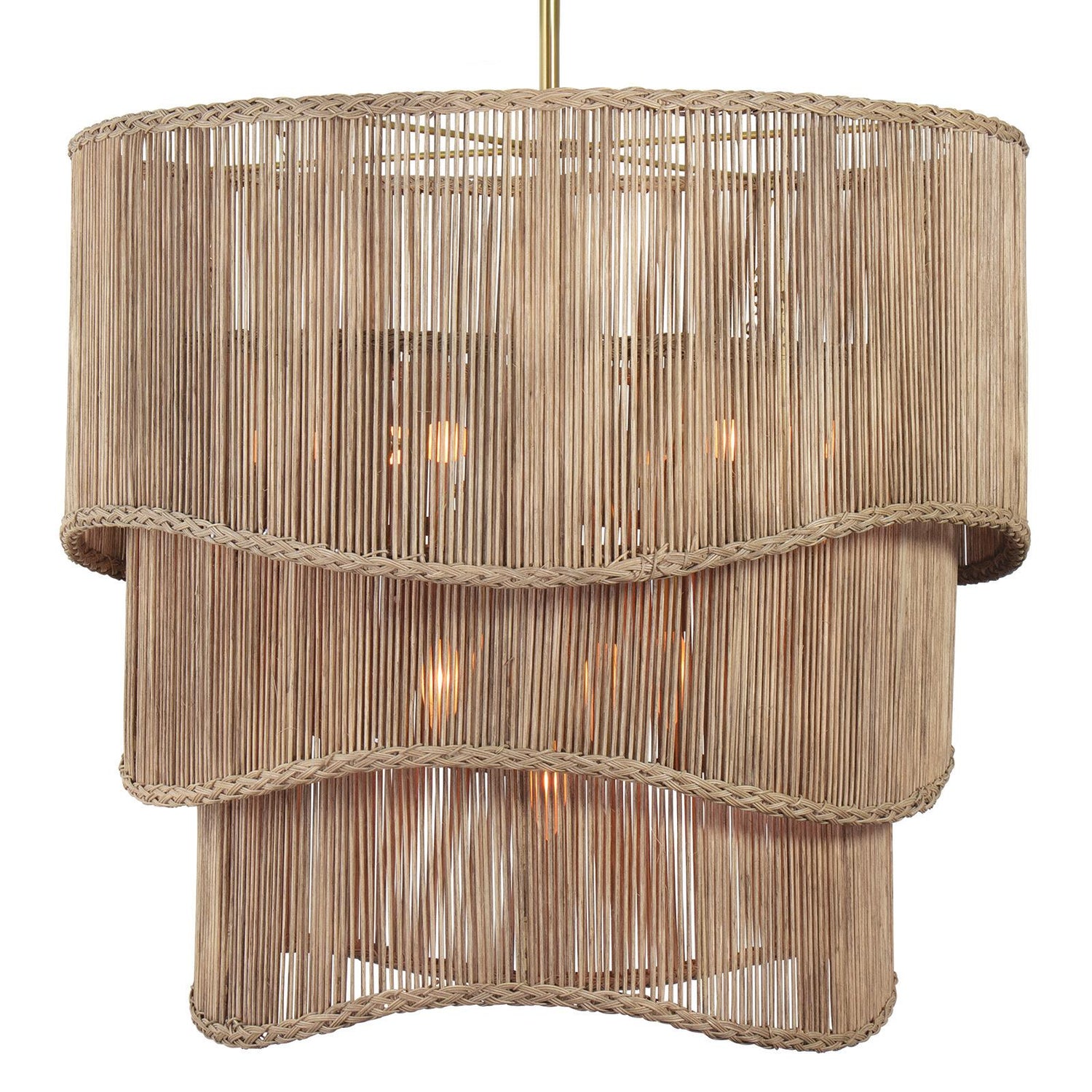 Three layers of woven drum shades with braided edges tier upwards, concealing a double bulb torch design in natural brass finish. The edges of the Nimes Chandelier shades ebb and flow, and the fixture's 11 bulbs evenly diffuse light with discreet elegance. This large fixture is a statement piece for any room in the house.