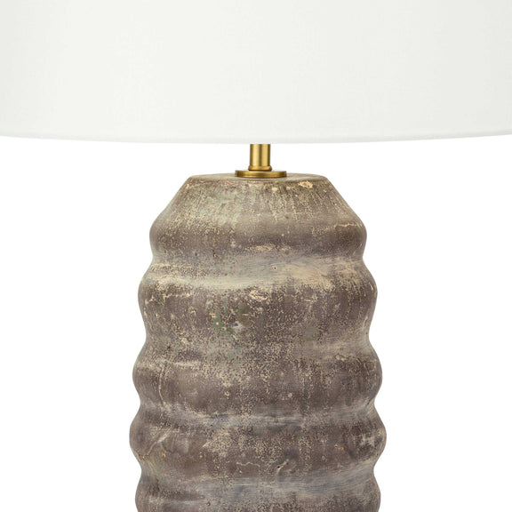 The Ola has been expertly crafted by artisan's hands to achieve the natural, organic look of true earthenware. Finished with a hand-applied, matte glaze, various shades of earthen brown and tan are displayed. The coloring and distressing are further enhanced by the natural, repeating curves that make up the lamp's body. Finished with an aged brass metal disc at the base and drum shade in natural linen at the top, the Ola is the perfect lamp to add to a space that welcomes the imperfect beauty of nature.
