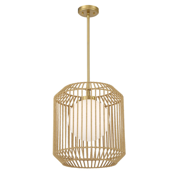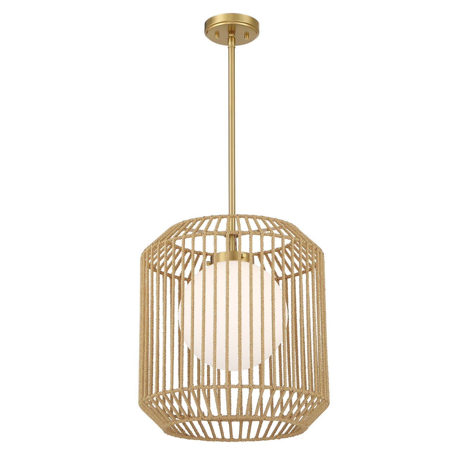 The Savoy House Pastis 1-light pendant beautifully blends a world of inspirations to create a picture-perfect lighting look. A cage-like shade is woven with natural rattan that adds terrifically touchable texture. An orb of white glass brings a bright glow that is amplified by the Warm Brass finish. Pastis is 16" in width and has an adjustable height ranging from 17.25" to 71.25". Uses one standard size bulb of up to 60 watts. Bulb not included. Comes with four 12" downrods and one 6" downrod.