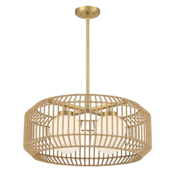 The Savoy House Pastis 4-light pendant beautifully blends a world of inspirations to create a picture-perfect lighting look. A cage-like shade is woven with natural rattan that adds terrifically touchable texture. Orbs of white glass bring a bright glow that is amplified by the Warm Brass finish. Pastis is 24" in width and has an adjustable height ranging from 9.5" to 63.5". Uses four candelabra size bulbs of up to 60 watts per bulb. Bulbs not included. Comes with four 12" downrods and one 6" downrod.
