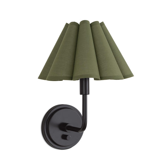 The Polly Wall Sconce brings an air of refined elegance with its single green scalloped shade, casting a warm and comforting glow on any wall and highlighting its rich, verdant hue. The gently curved arm adds a touch of classic sophistication, blending seamlessly with both modern and traditional styles to enhance any space with grace and style.