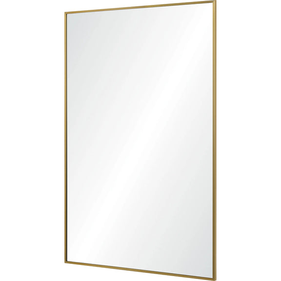 The simple addition of a satin brass-finished iron frame takes this standard mirror design to new heights. Set in the mid-century interior, its radiant warmth is further enhanced by complementary accessories in its midst. It has a substantial structure yet still integrates effortlessly.