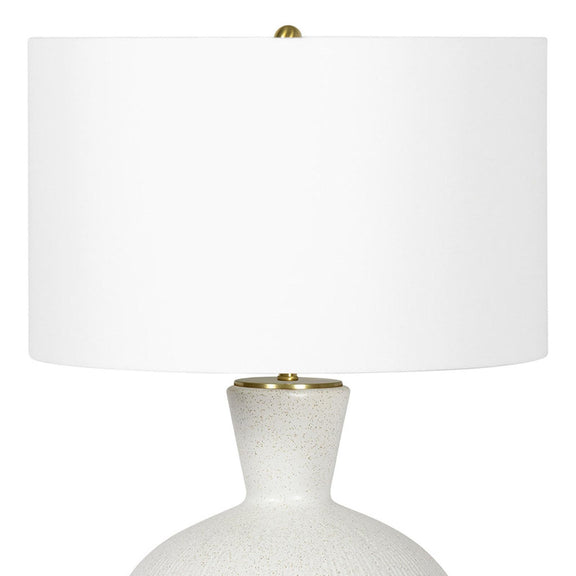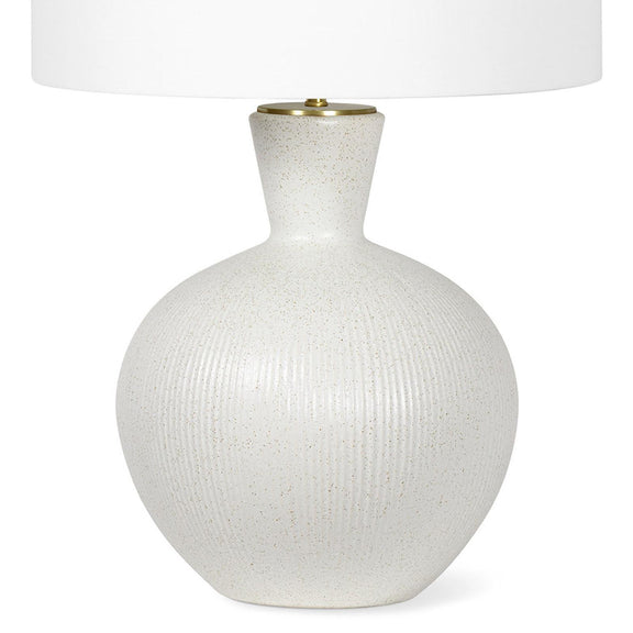 The rounded, white Reyka Ceramic Table Lamp has an artisan glaze finish in matte white and is detailed with light flecking. The vertical line detail sits in contrast to the large, rounded shape of the base, giving off a true Mid Century modern vibe.