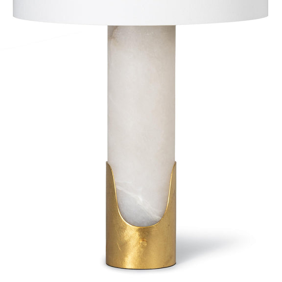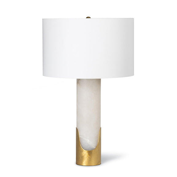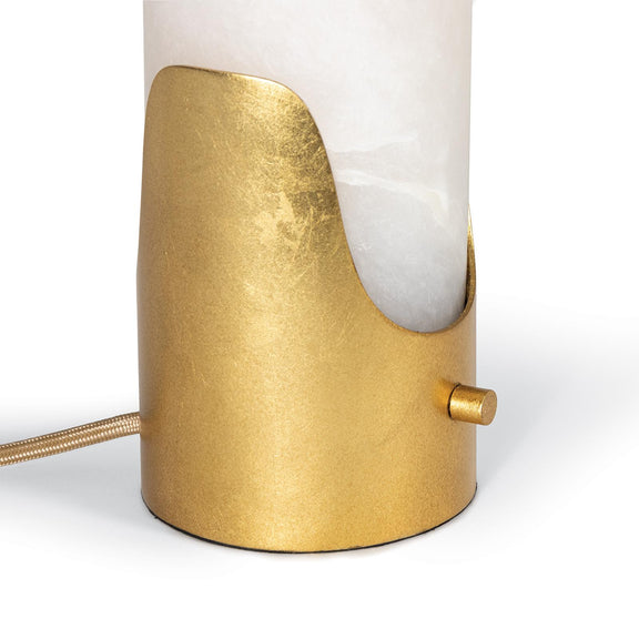 The Sacha Alabaster Table Lamp embodies timeless elegance with its base crafted from alabaster, gracefully nestled into a metal base adorned with a luxe gold leaf finish. This lamp boasts a polished design that is particularly special, showcasing the natural variation inherent in alabaster. Illuminate your space with the Sacha Alabaster Table Lamp, a sophisticated fusion of refined craftsmanship and the inherent beauty of natural materials.