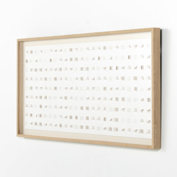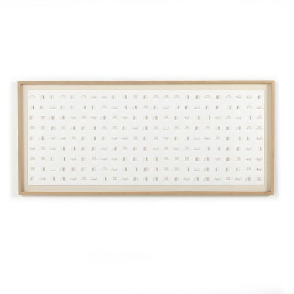 Paper cutouts add layers of color and texture to this piece and any space. Framed in vertical grain white oak for a gallery-quality look. If not currently in stock, this texture-enhanced piece ships within three weeks. Designed by Four Hands Art Studio and handmade in Austin, Texas.