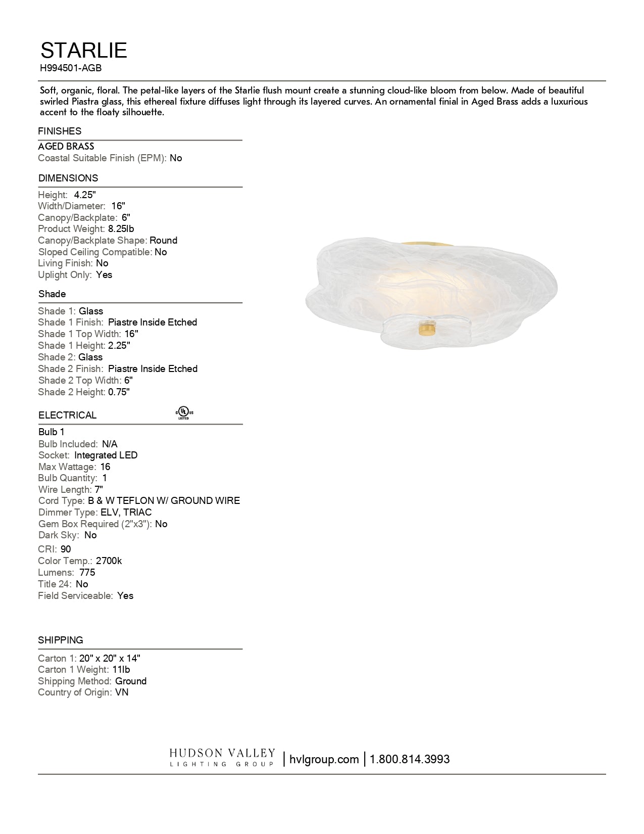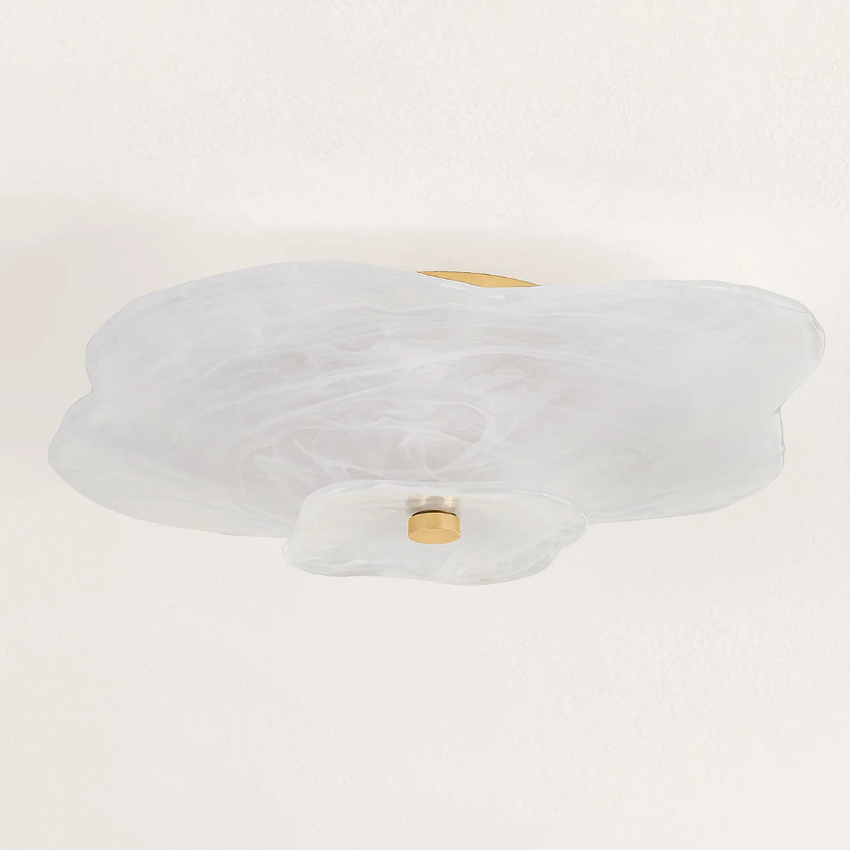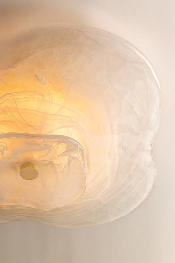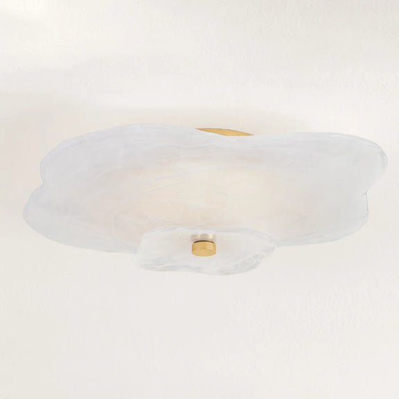 Soft, organic, floral. The petal-like layers of the Starlie flush mount create a stunning cloud-like bloom from below. Made of beautiful swirled Piastra glass, this ethereal fixture diffuses light through its layered curves. An ornamental finial in Aged Brass adds a luxurious accent to the floaty silhouette.