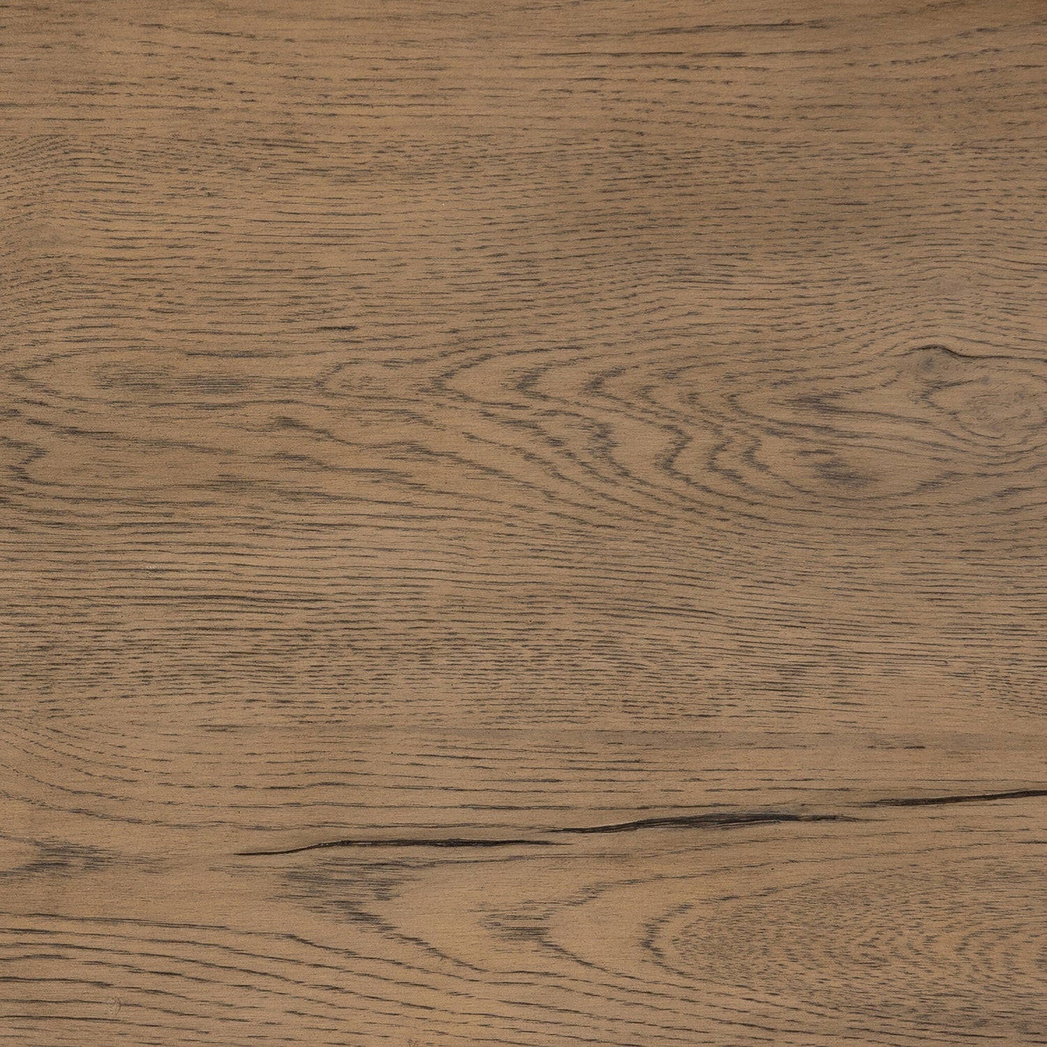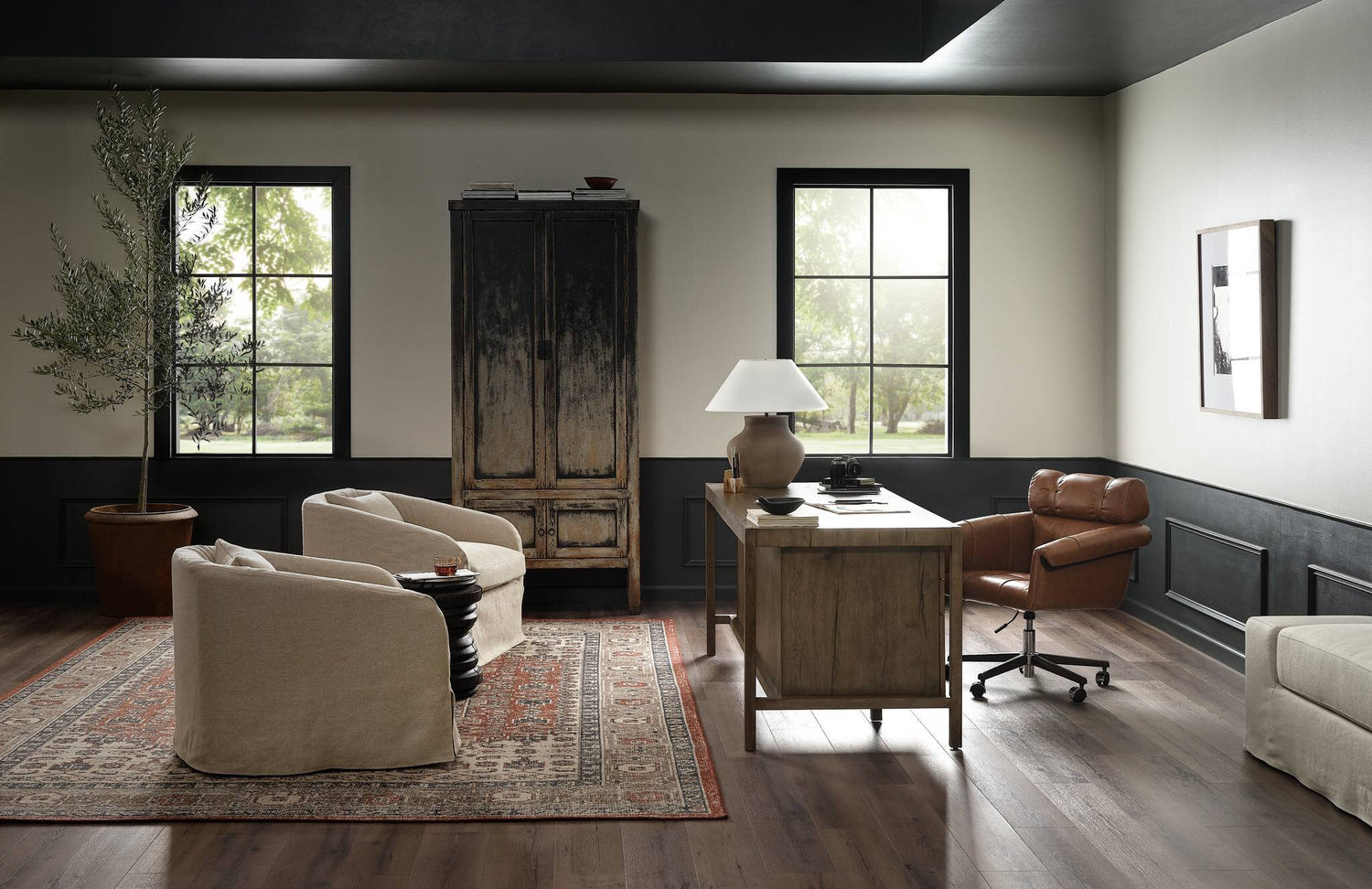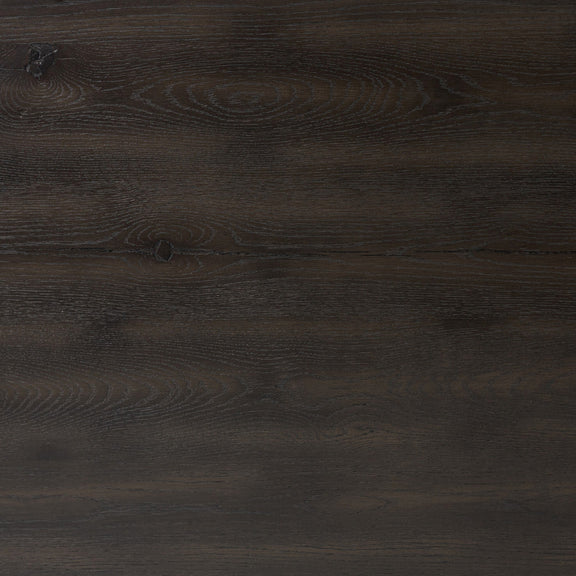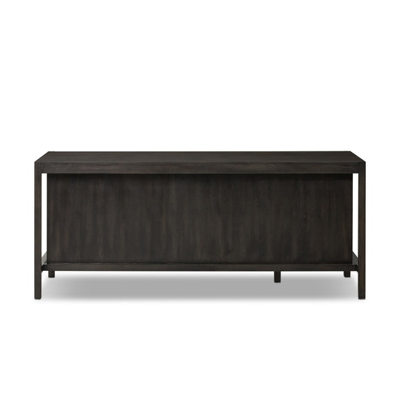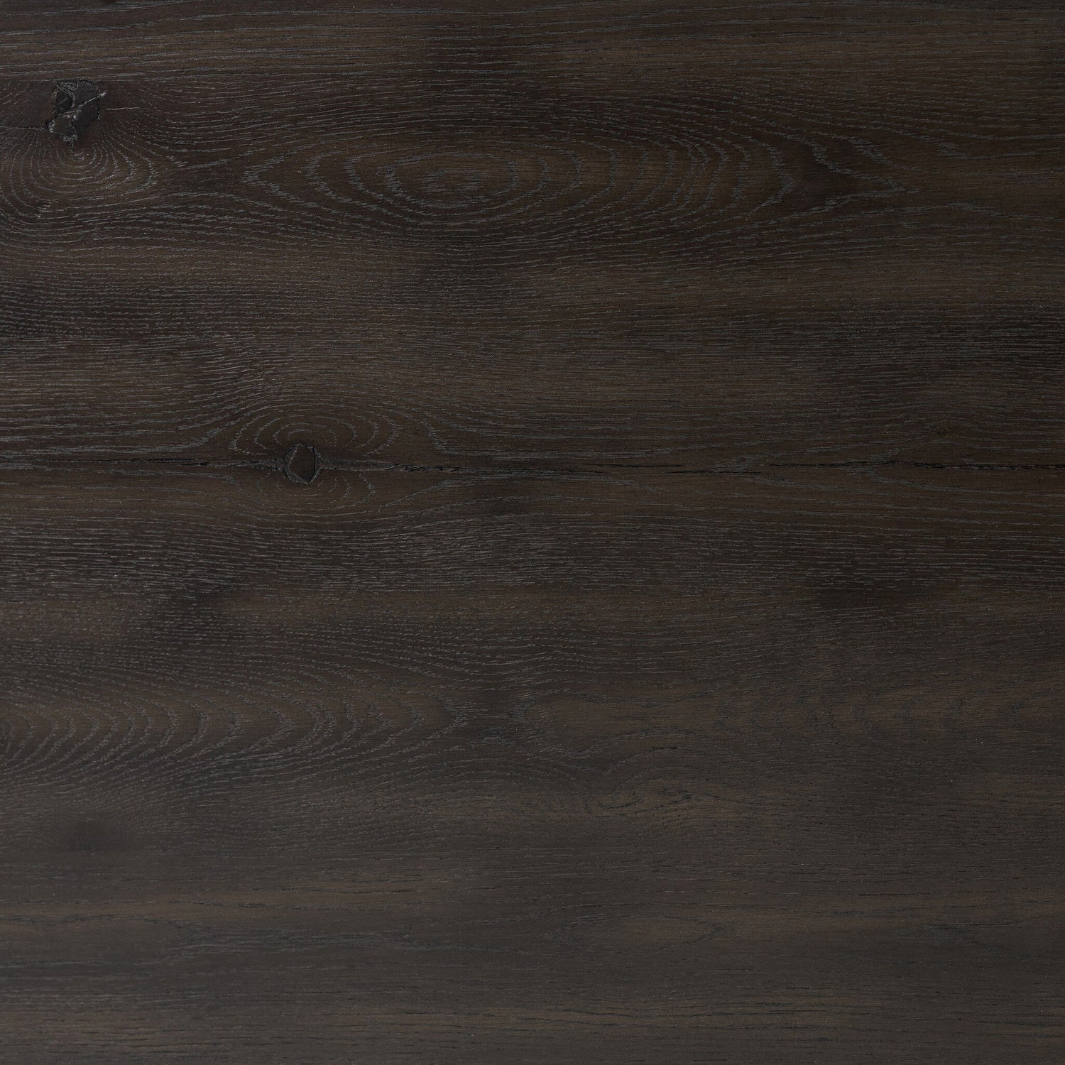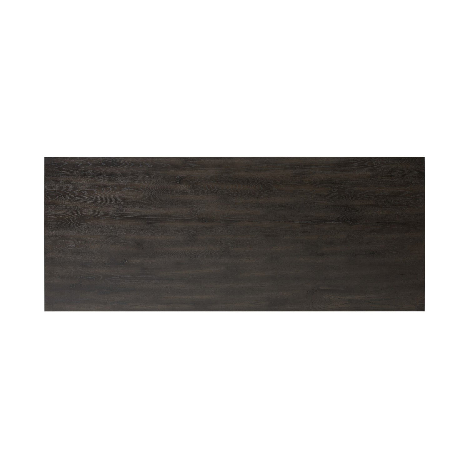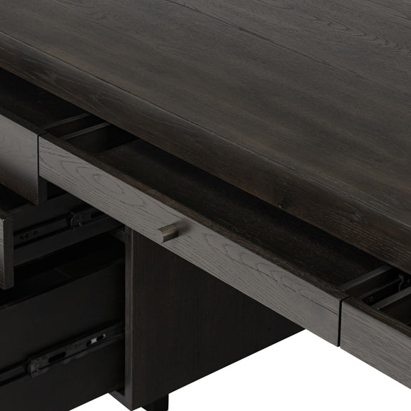 Made from solid oak and oak veneer and finished in a smoky black, an executive-size desk features a fully finished back, offering the option to float-style in a room. Plenty of varied-size drawers offer generous storage space.