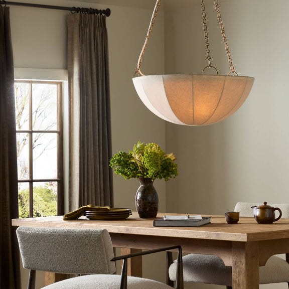 Set the mood with a Baroque-inspired pendant of oval-linked chaining and a flax-linen dome. Metal boning supports the airy spherical shade, while a brass frame adds to the warm glow.