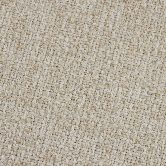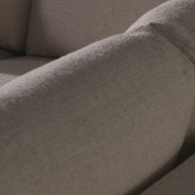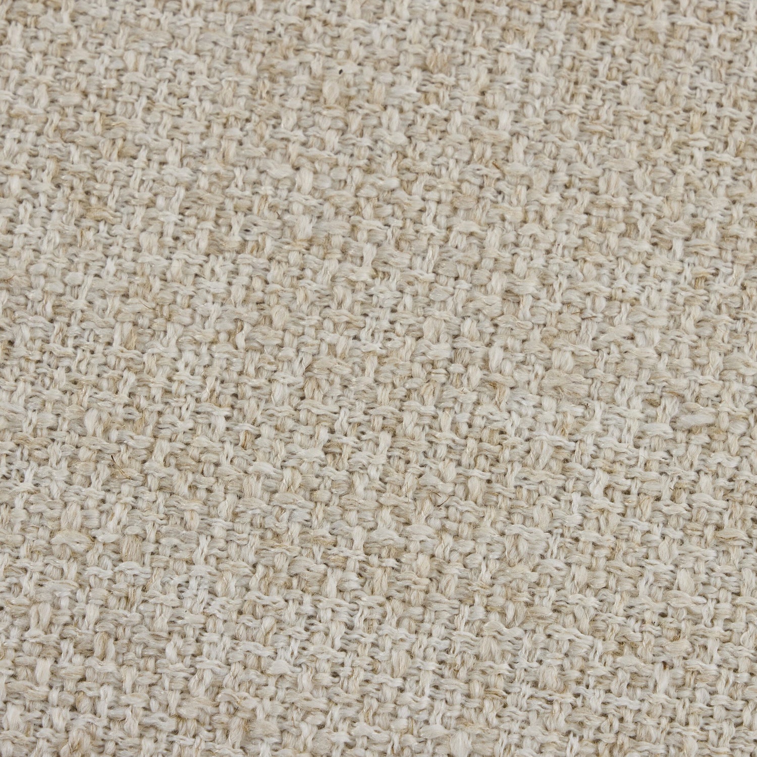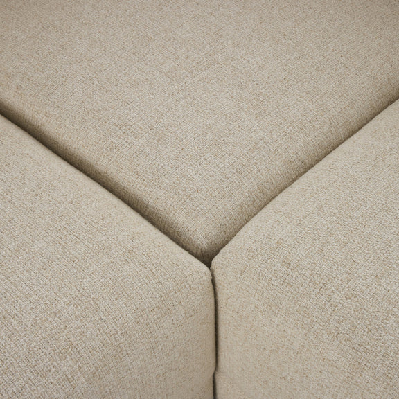 An elevated take on the modular sectional, featuring clean lines and loose back and arm cushions. A smooth linear base is fully upholstered and wraps up the arms for a shelter effect. Covered in a cream basketweave fabric that brings both texture and comfort to the entire piece.