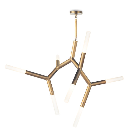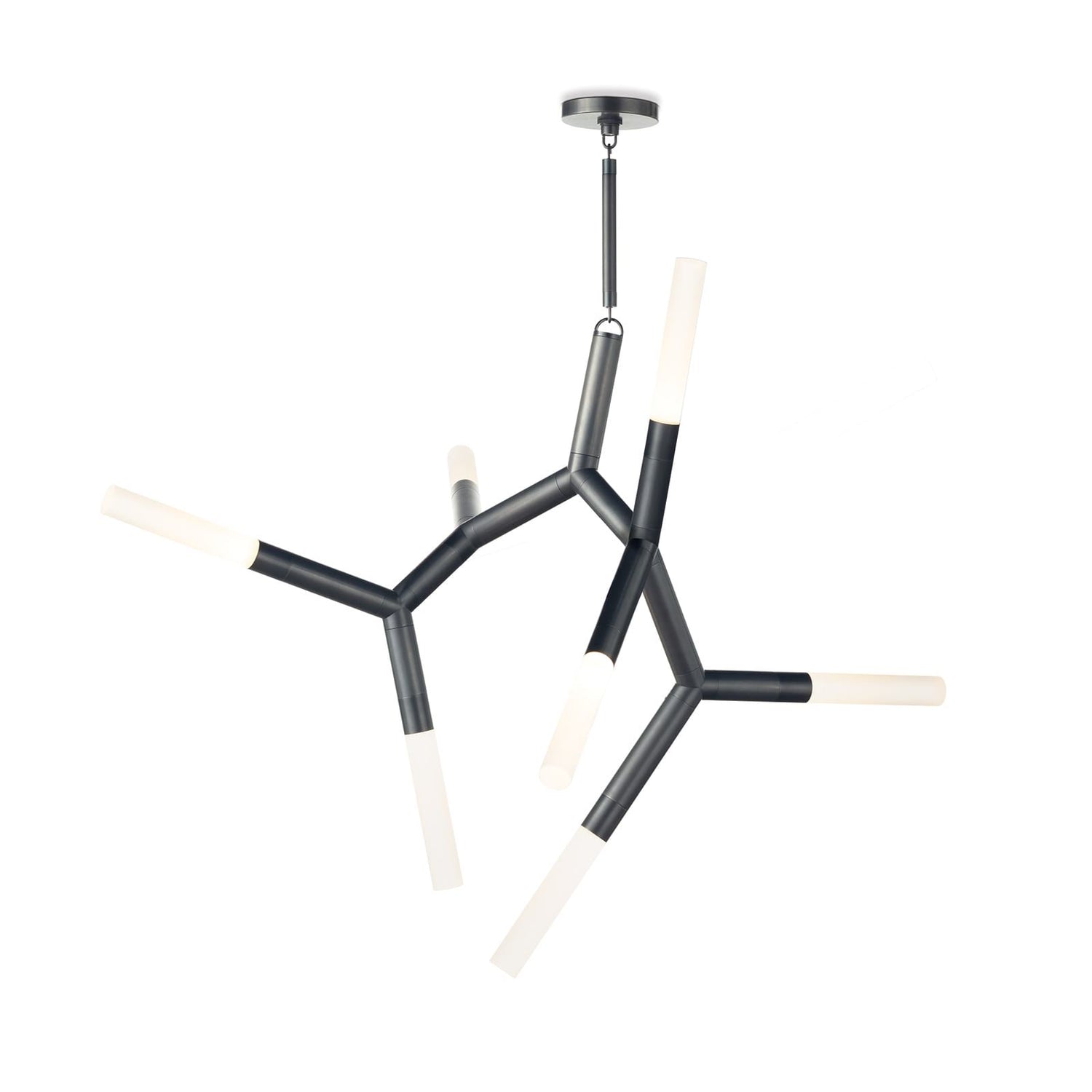 Our Traveler Chandelier is the epitome of modern dynamism with its multiple, branching end points finished in custom frosted acrylic bulb covers. Expertly engineered to hang at a slight angle, place this sculptural wonder over a table, in an office, or entryway for a modern lighting statement piece.