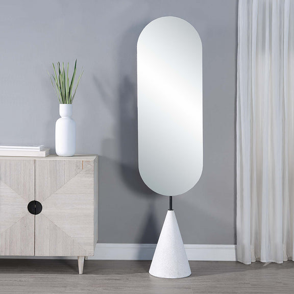 The full-length mirror gets a designer makeover in this design. Serving as both an art installation and everyday essential for getting a glimpse at oneself before heading out the door, this floor-length mirror is best suited for placement in a contemporary bedroom interior. Styled with sleek furnishings, this standing mirror's captivating design has a full chance to shine.