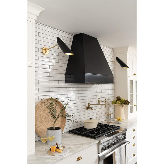 With its conical shape and two-tone finish, the Vest Swing Sconce has clean lines and is buttoned-up, much like a well-tailored tuxedo. Its swing arm allows you to position the light for different tasks. The overlapping steel fixture has a blackened brass exterior and contrasting natural brass interior with details for a distinct mid-century modern vibe.