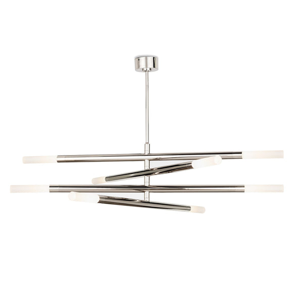 Four arms swivel around a center point on our modern, linear Wick Chandelier. Create a unique, dynamic design in your modern loft, entryway, or over a dining table. Wick's frosted acrylic bulb covers add the perfect amount of diffused light to your space.