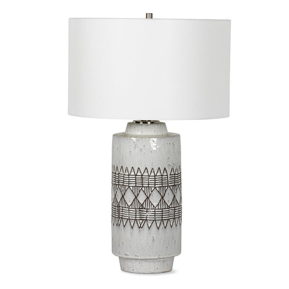 The intricate, ink-like pattern transversing the middle of the Zuri Ceramic Table Lamp was inspired by the ancient art form of henna. This unique ceramic piece brings to mind visions of distant lands and travel adventures.